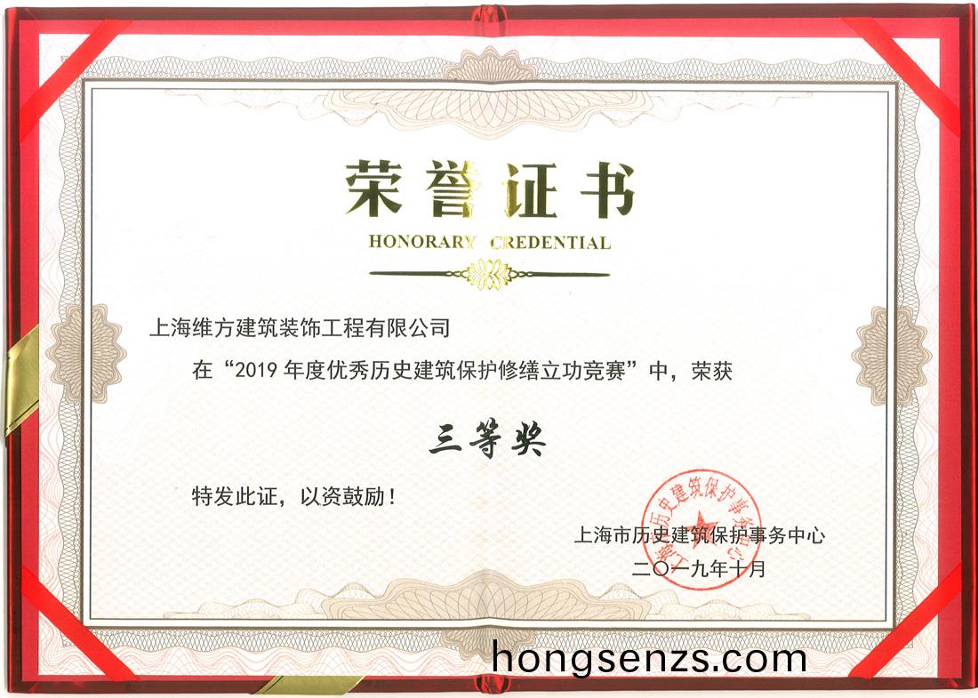 公司取得上海市2019年度優(yōu)秀歷史建築保護(hù)脩繕立功競(jìng)賽三等獎(jiǎng)
